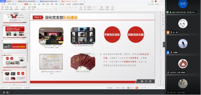 2020年是极不平凡的一年,虽然疫情造成了诸多不便,但各个党支部对于支部工作毫不懈怠,创办了丰富多彩的线上线下活动,例如计算机科学系博士生党支部利用超算平台,开发疫情监控与服务大数据智能分析系统,为政府新冠疫情防控提供信息和决策支持、通信工程系本科生第一党支部开展“街校共建”系列志愿服务活动,深入开展暑期“三下乡”社会实践等,都充分发挥了党支部的战斗堡垒作用。