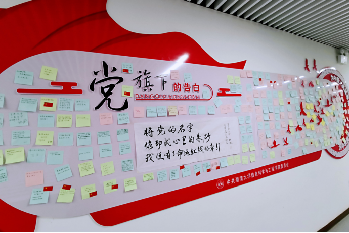 最后,全体师生与党旗同框、在党旗下告白。大家将告白宣言写在心愿贴纸上,向党献上最诚挚的祝福。各支部也纷纷合影打卡,定格下美好瞬间。