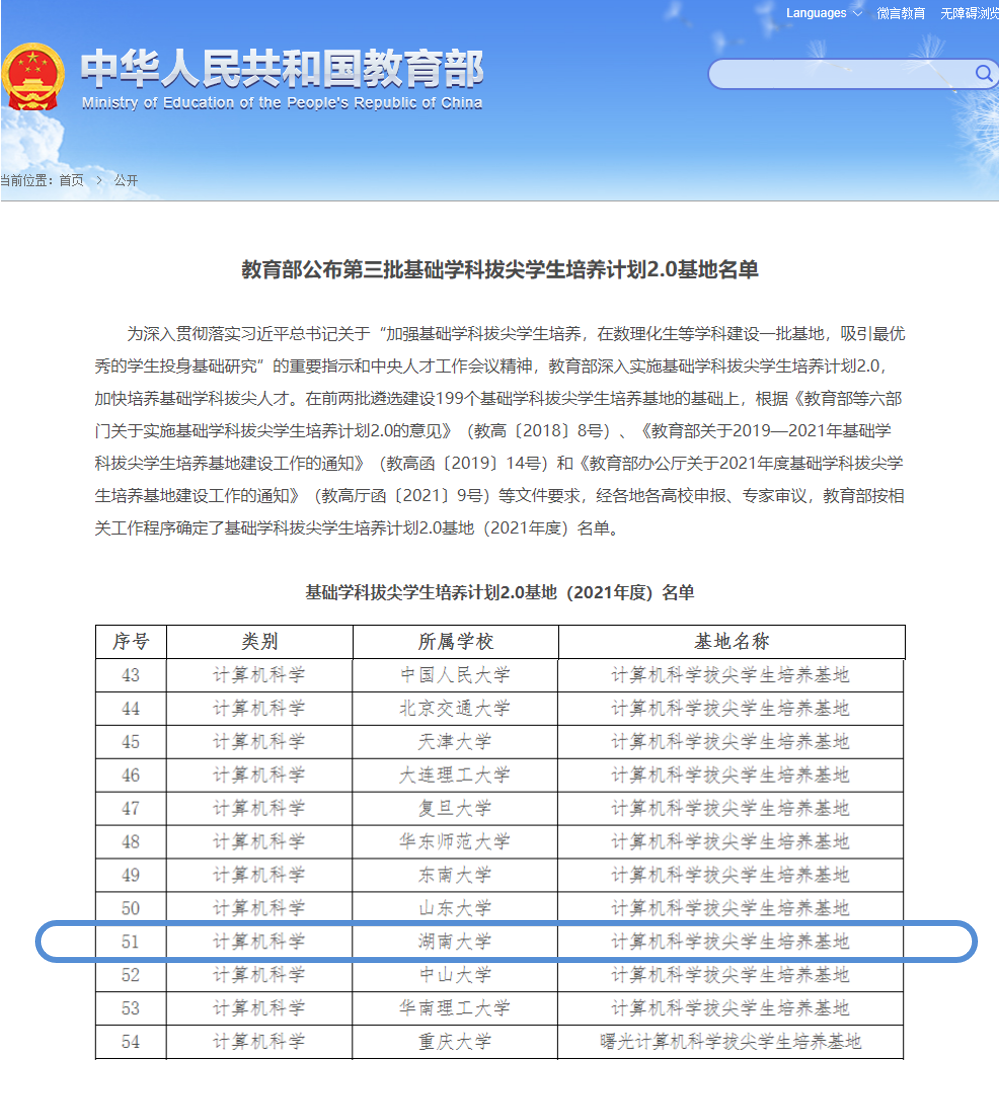 此次入选的计算机科学拔尖学生培养基地,将在前期探索基础上,围绕立德树人根本任务,把握“选、评、培”三个关键环节,系统整合优质教育教学资源,全面升级拔尖人才培养体制机制,培养具有国际竞争力的新时代高素质拔尖创新人才,建成富有湖大特色的计算机科学拔尖人才培养基地。