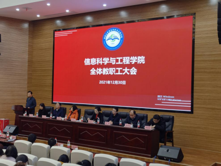 全体教职工大会在学院201报告厅召开。校长助理、院长李肯立代表学院作2021年工作报告,院党委书记彭嘉芬主持大会并作总结。