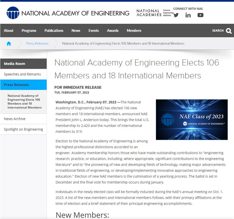 美国国家工程院院士是工程领域专家的最高专业荣誉之一,以表彰入选者在工程研究、实践、教育等方面做出的重大贡献,在新兴领域技术做出的开拓性工作和传统工程领域中的重大贡献以及在开发/实施工程教育方面的创新贡献。