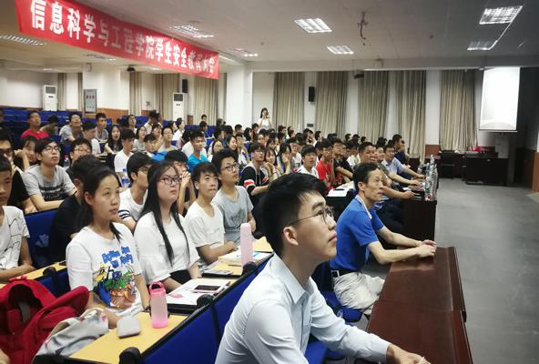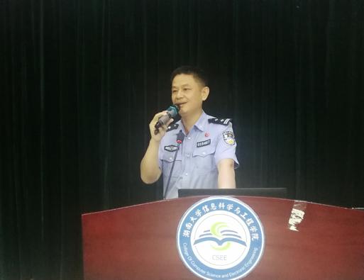 院楼330教室开展了学生安全教育大会,本次安全教育主讲人是湖大驻校民警保卫处课程组程志警官,嘉宾是保安处治安科黄发林主任。
