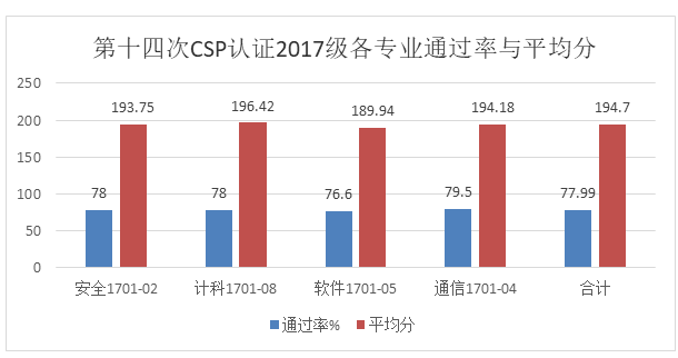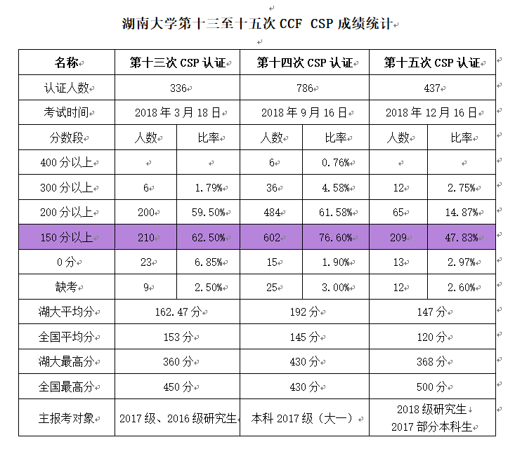 今年三次CCF CSP认证,我院考生也取得了较好的成绩:第十三次平均分162(全国平均分153)、第十四次平均分192(全国平均分145)、第十五次平均分147(全国平均分120),特别是在9月16日的第十四次认证中,平均分创我院历史新高,据CCF CSP官网新闻数据显示每所高校前20名学生的平均分我校位居全国第一,400分和300分以上人数我校均位居全国第一,本次认证考试我院有586名2017级本科生参加,其中400分3人,150分及以上457人,通过率78%,平均分194.7,是我院自2013级本科生参加认证以来成绩最好的一次。