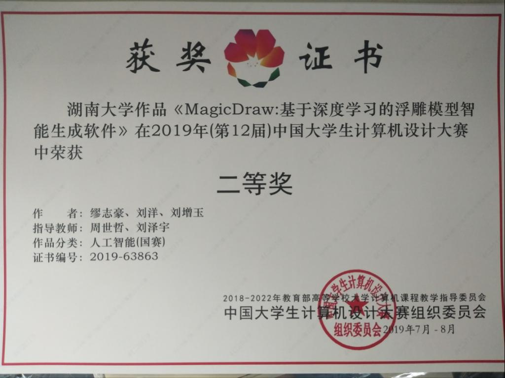 本届大赛由教育部高等学校全国大学计算机课程教学指导委员会主办,全国决赛由吉林大学承办。初赛吸引了来自全国各地高校的1万多支队伍报名参加。我院的参赛作品”MagicDraw:基于深度对抗网络的笔画式浮雕建模”(指导老师:周世哲,领队老师:李小英)首先在6月中旬的中南赛区获得了一等奖,并入围全国总决赛。来到吉林大学的决赛队伍包括了来自中文黄色网站