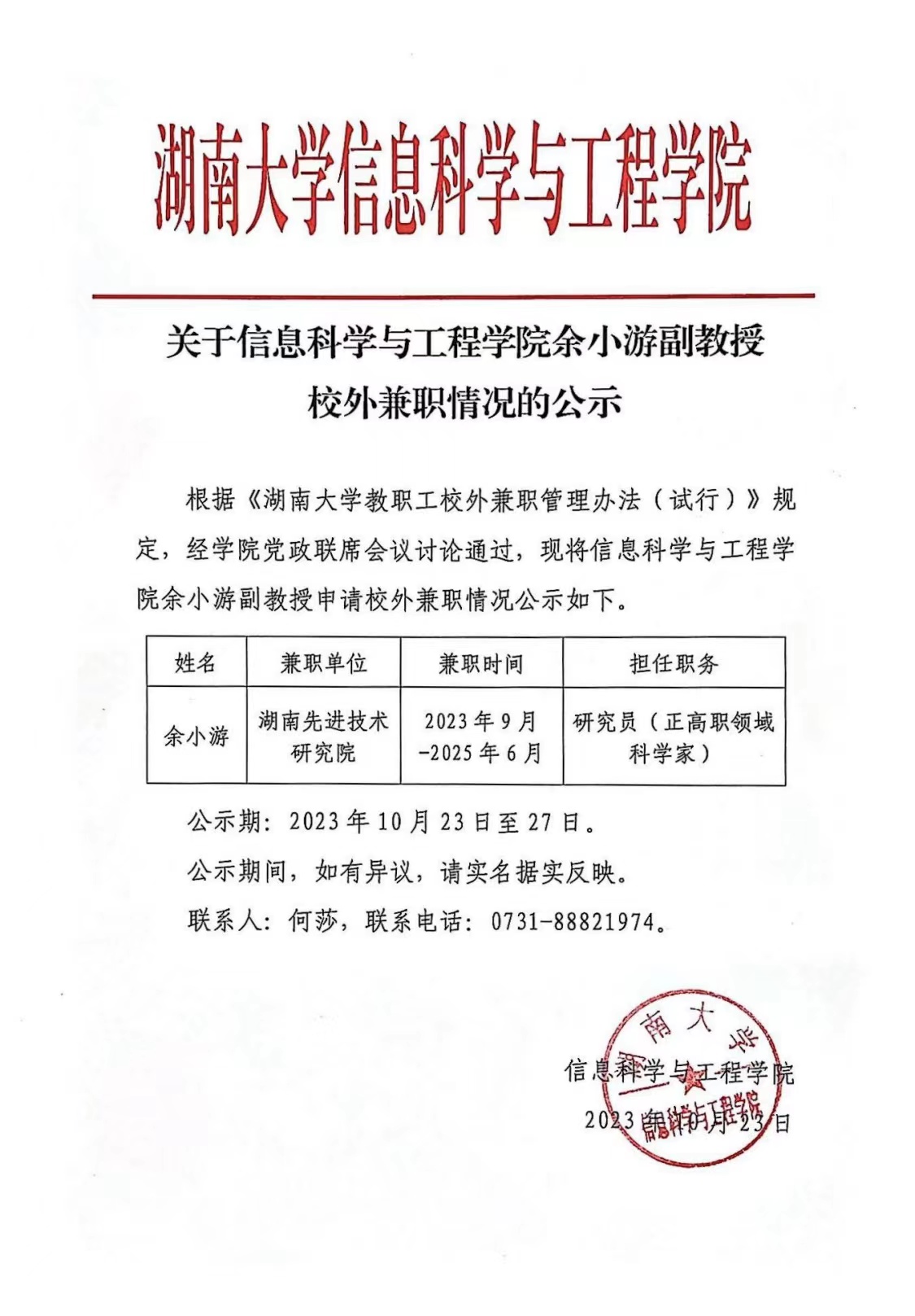 关于中文黄色网站 余小游副教授校外兼职情况的公示