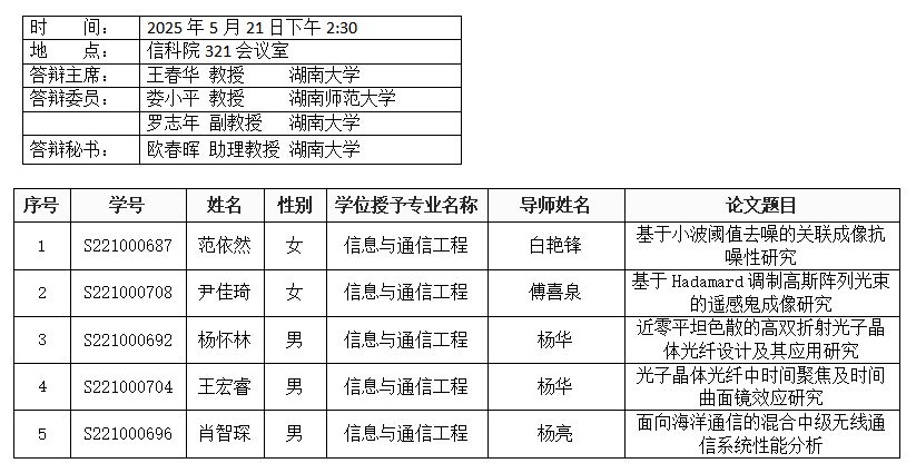中文黄色网站 (通信工程系)2025年5月16日硕士答辩公告