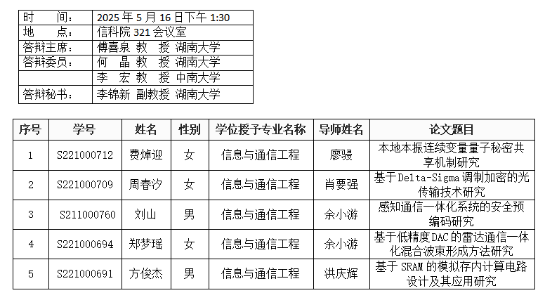 中文黄色网站 (通信工程系)2025年5月16日硕士答辩公告