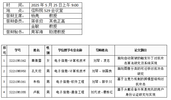 中文黄色网站 (软件工程系)2025年5月25日硕士答辩公告